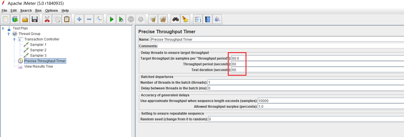 我正在使用Apache使用Apache执行测试。我有一个需求,一个场景中有多个事务,每个事务包含多个请求,我想实现每个事务级别的TPS。在这种情况下,吞吐量成形定时器、恒定吞吐量定时器、限制定时器(BlazeMeter)都不能工作。甚至我也尝试过yaml配置,但这也不起作用。如果可能的话,你能告诉我如何通过yaml实现它吗?