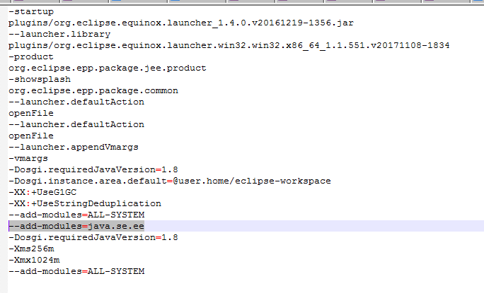 请注意,eclipse.ini中的设置引用了用于运行Eclipse /JDK。用于开发的JRE或更好的JDK(查看源代码)必须在窗口> Preferences:> Installed JREs中指定。