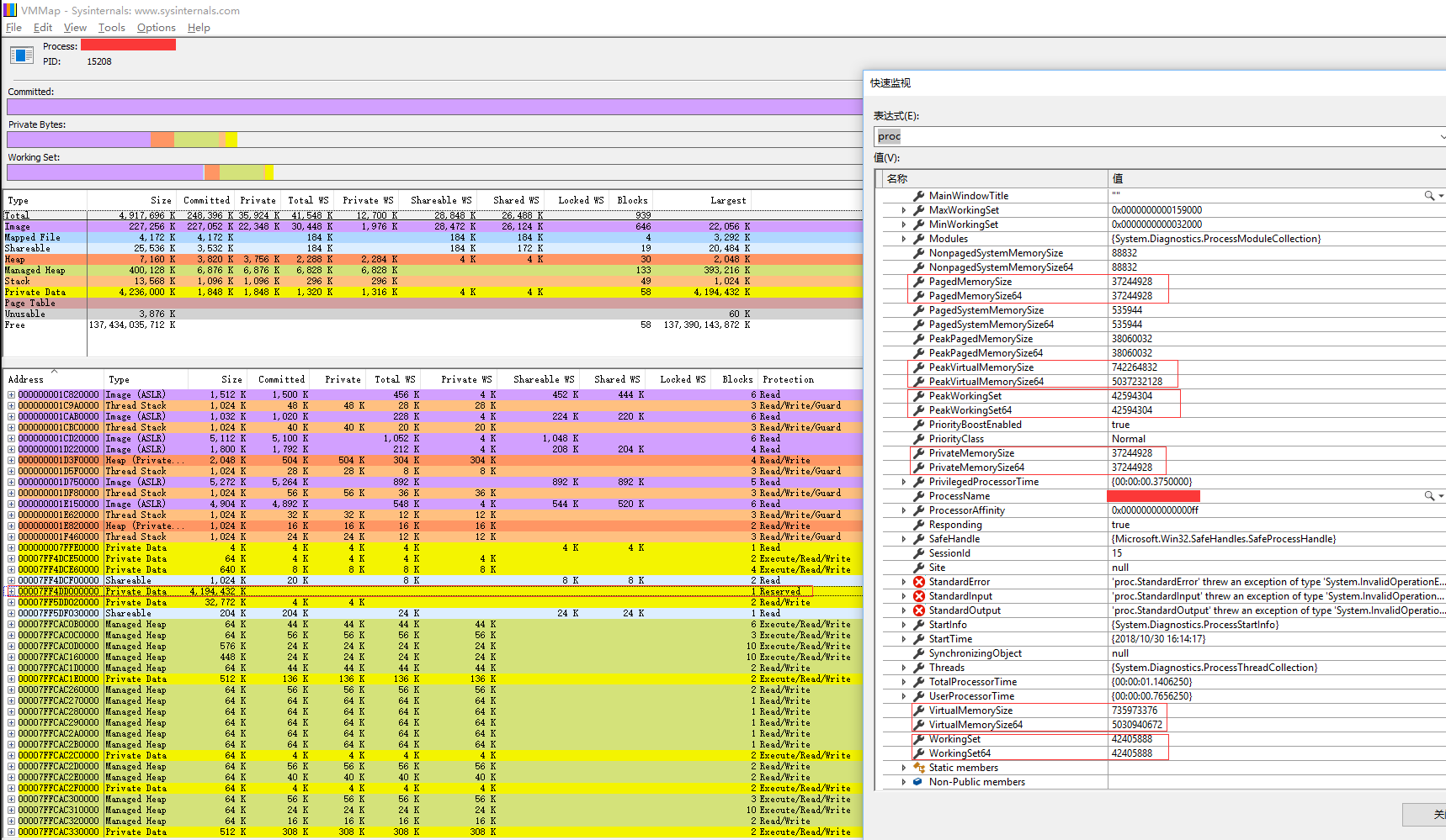 在VMMap中,进程总内存大小约为5GB,预留内存约为4GB,VS监视器显示VirtualMemorySize64约为5GB,我不知道如何才能获得总使用内存。在VMMap中有4GB的预留内存,如何使用.net进程类获得预留内存。
