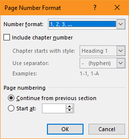 据我所知,MS Word GUI只允许您继续上一节中的页面编号,或者允许您手动处理页码:
