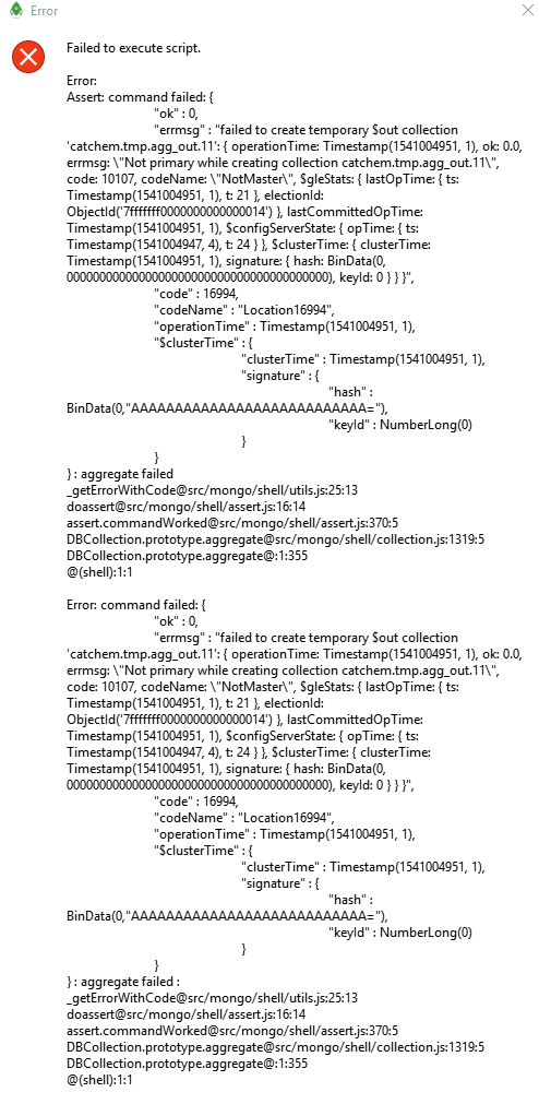 我需要运行一个聚合查询,它需要将一些文档输出到同一个数据库上的另一个集合。我目前遇到的问题是,如果没有$out阶段,查询就能工作,但是当我进入$out阶段时,它只会给出以下错误: