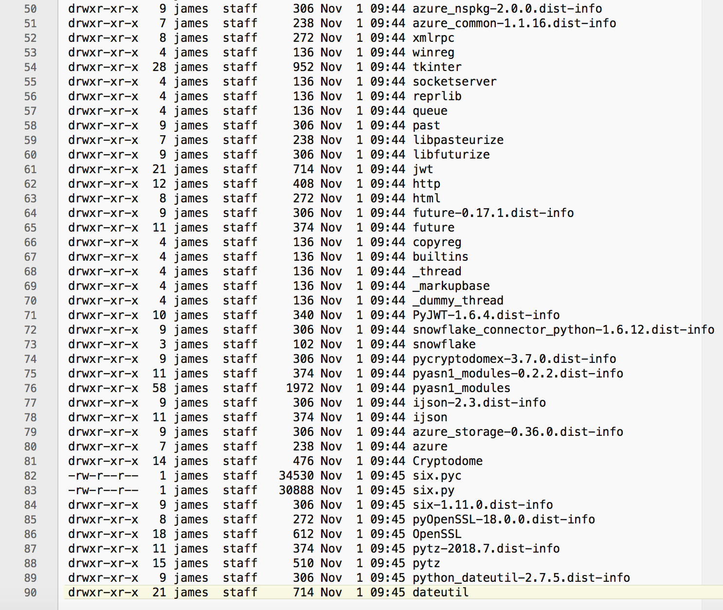 drwxr-xr-x 69 james staff 2346 Nov 1 09:24 setuptools