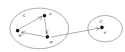 注意,Kosaraju的算法在这两种情况下都有效,因为它从列表的末尾开始(两种情况下都是节点u ),并通过对反向图的DFS搜索提取组件C。当我们到达列表中的节点C'时,组件v将被提取。