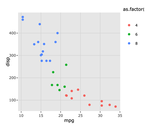 geom_point(aes(x = mpg, y = disp, col = as.factor(cyl), text = rownames(mtcars)))