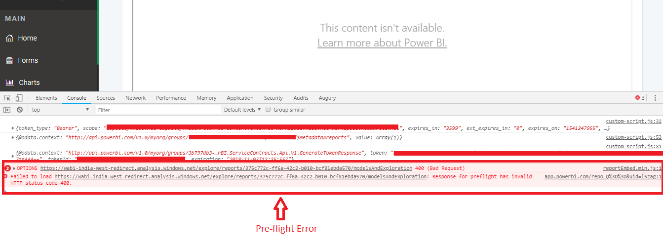 我使用来集成或嵌入在Power中创建的报告。通过使用这些API,我可以获得访问令牌、嵌入令牌、报表Id、数据集Id和嵌入URL,但是当我使用J query嵌入报表时,它会给出pref-light错误。所以,请让我知道如何解决这个错误。此外,我有权力BI专业帐户。下面是错误的API和屏幕截图。