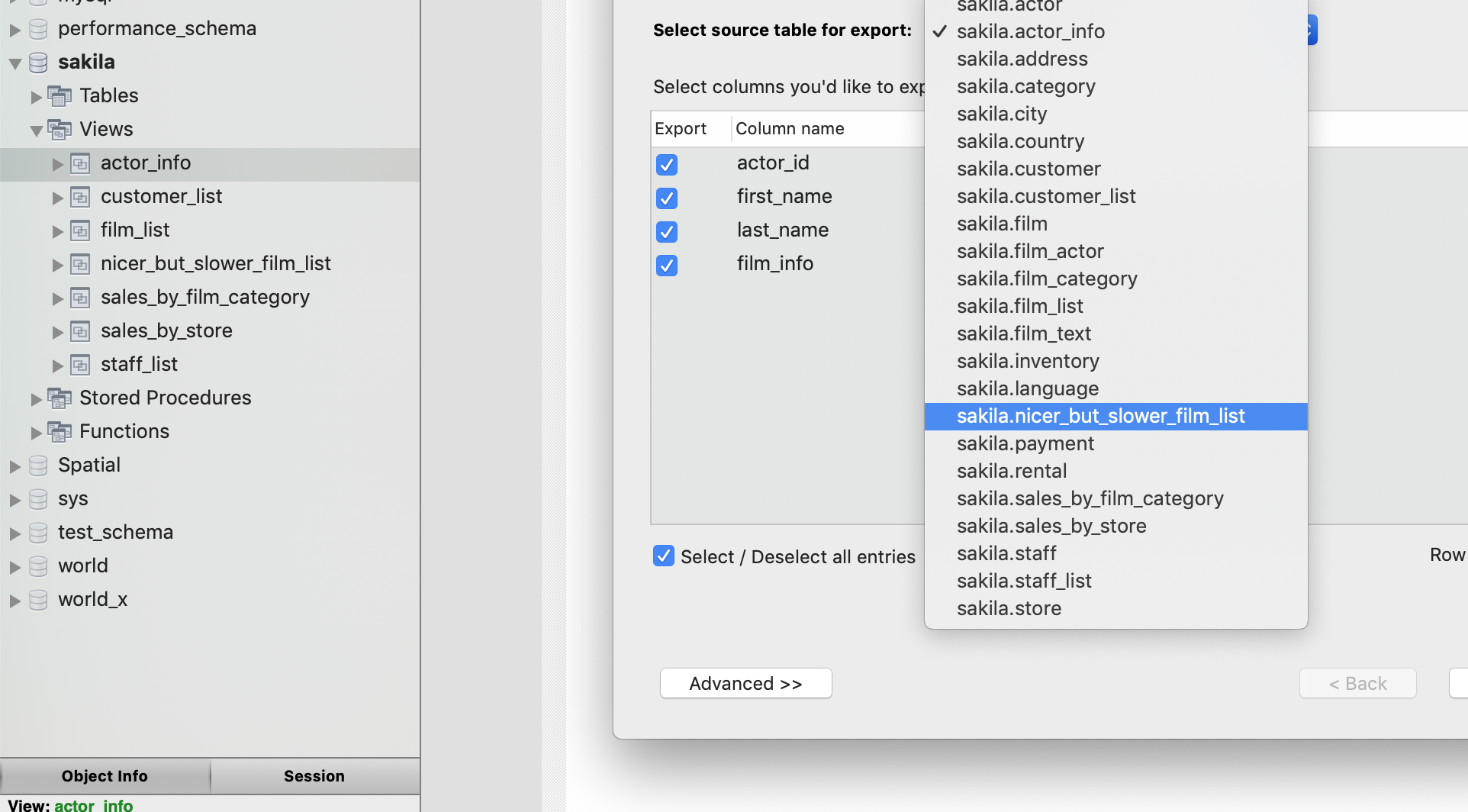 目前,Table Export Wizard菜单项仅在架构树中的表节点上可用。但是仔细看看:向导仍然不仅列出表,还列出视图: