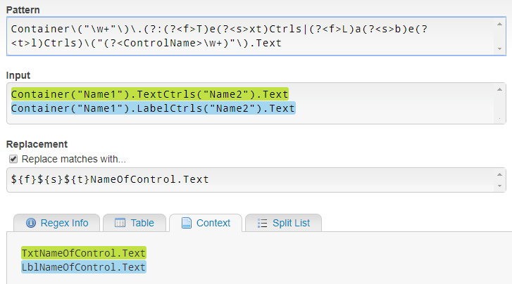 我想匹配术语"TextCtrls“和"LabelCtrls”。当我找到"TextCtrls“时,我想用"Txt”代替,当我找到"LabelControls“时,我想用"Lbl”代替。在线演示