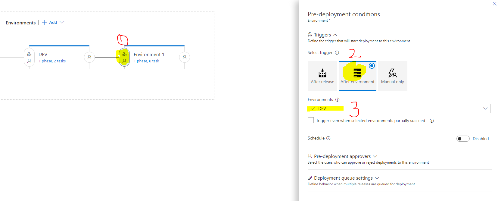 从下面的管道,假设DEV 2和QA具有低优先级,这意味着我想首先部署DEV (第一优先级)。