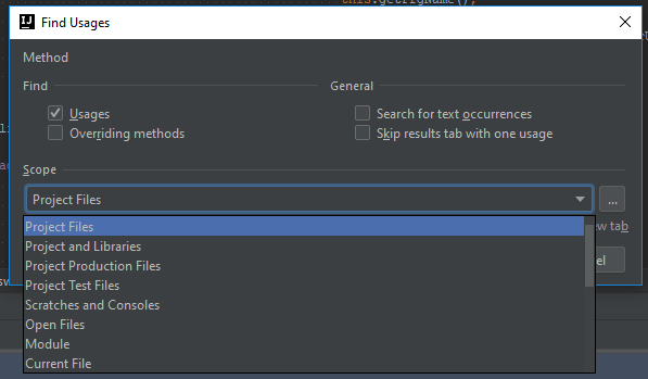您可以通过“查找用例设置”(默认为Windows: CTRL+ALT+SHFT+F7)限制搜索范围。