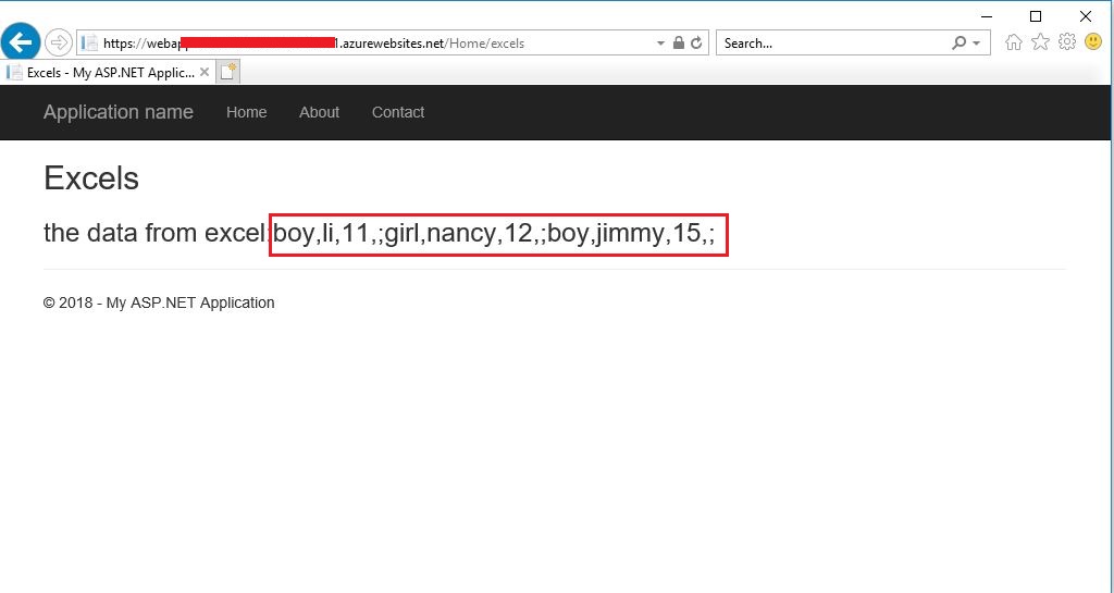 }步骤5:在发布到azure之后,启动站点并查看结果-> excel中的所有数据都被读取: