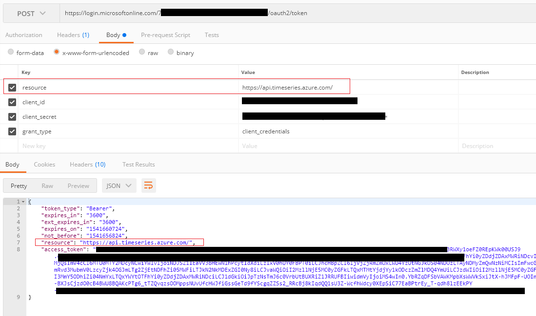 我尝试给令牌url提供'https://api.timeseries.azure.com/‘资源/受众/作用域,但是API继续返回相同的错误消息:
