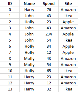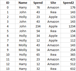 df=pd.DataFrame({'Name':['Harry','John','Holly','John','John','John','Holly','Holly','Molly','Molly','Holly','Harry','Harry','Harry'], 'Spend': [76,43,23,43,234,54,34,12,43,54,65,23,12,32],