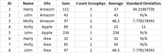 Name Site Sum Count Groupbys Average Standard Deviation