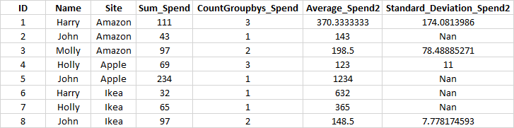 Name Site Sum_Spend CountGroupbys_Spend Average_Spend2 Standard_Deviation_Spend2