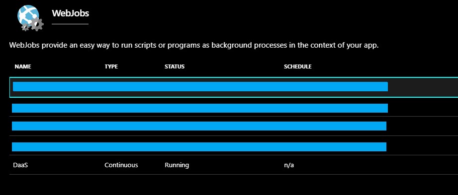 [11/10/2018 14:00:16 > 60c00d: SYS INFO] WebJob is still running这并不能告诉我很多。请让我知道这是一个新的功能,或我得到ABTested,或如果您认为可以禁用/删除。谢谢。