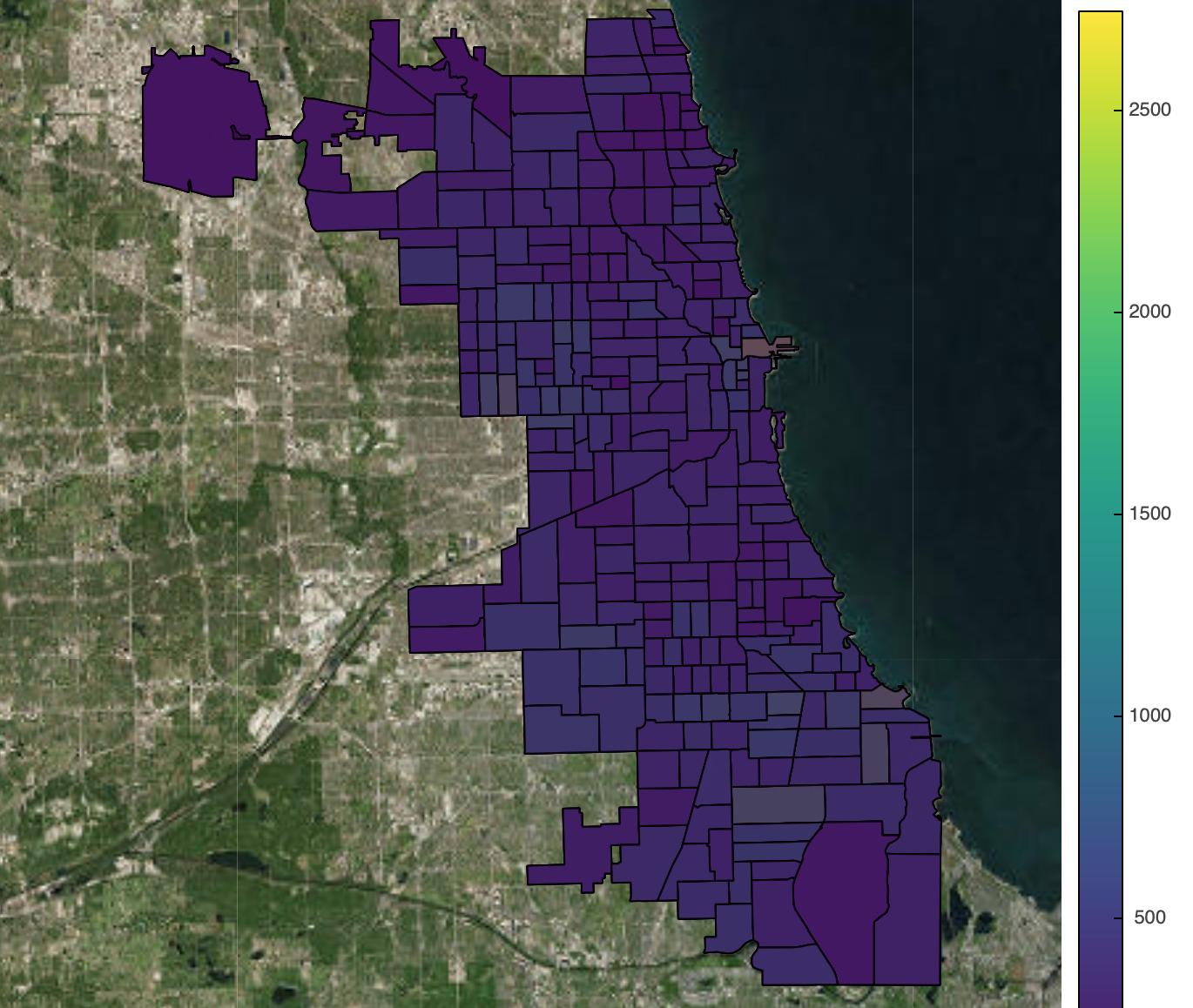 gts.ESRI *gv.Polygons(gdf, vdims=['beat_num', 'Total_Crimes'], label='Chicago Crime Data').opts(plot=plot_opts,style=dict(alpha=0.7))输出: