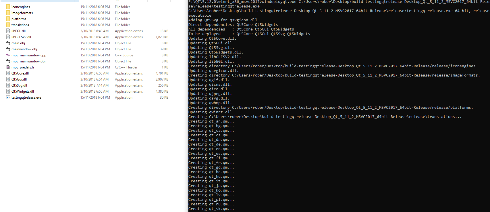 好的,我解决了,显然命令windeployqt.exe C:\Users\rober\Desktop\build-testingqtrelease-Desktop_Qt_5_11_2_MSVC2017_64bit-Release\release\testingqtrelease.exe没有工作,因为qt构建版本和windeployqt.exe之间的版本不兼容