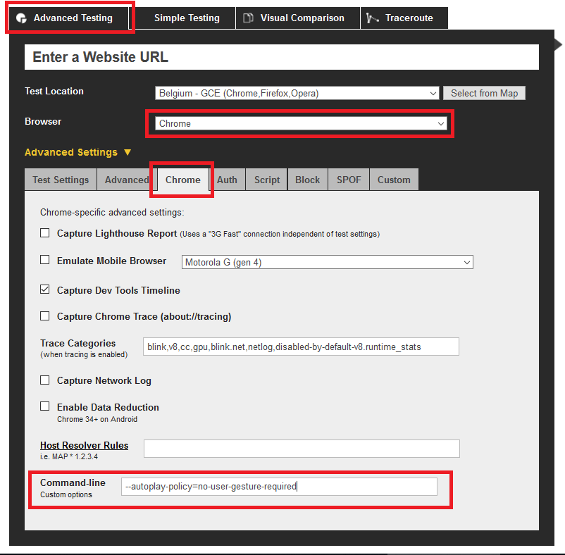 我有一个页面,我想在WebPageTest中测试Chrome,但它有一个自动播放视频,Chrome自动播放策略默认不允许自动播放。