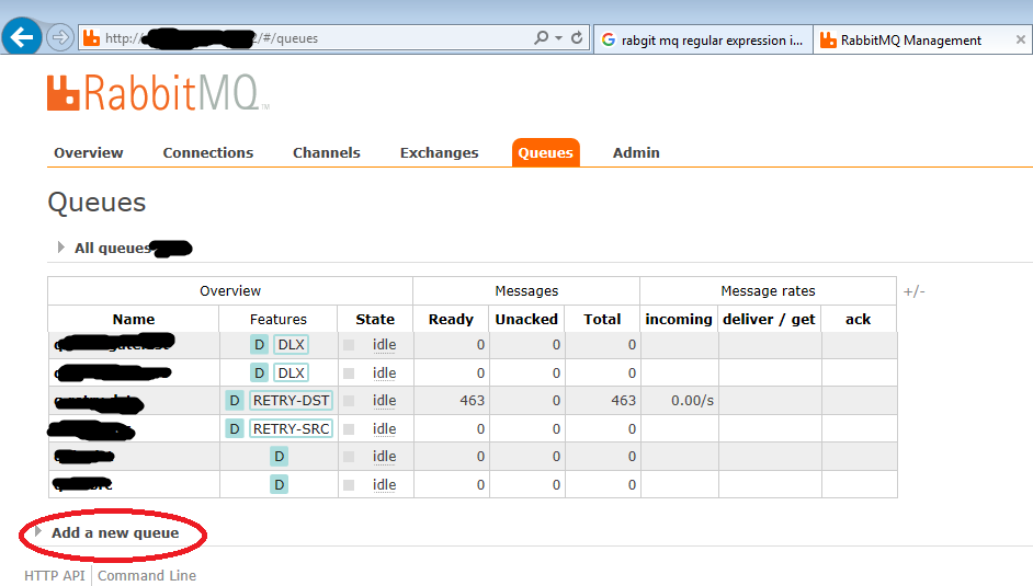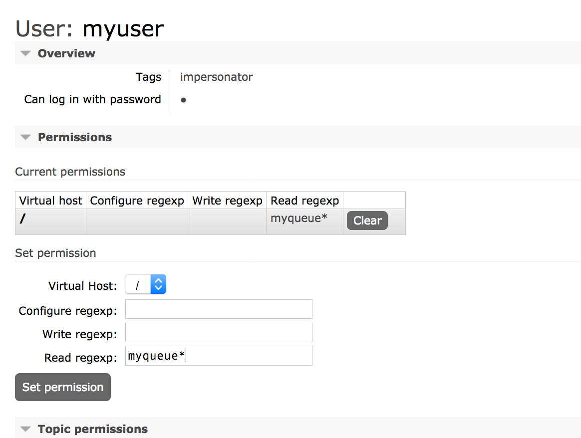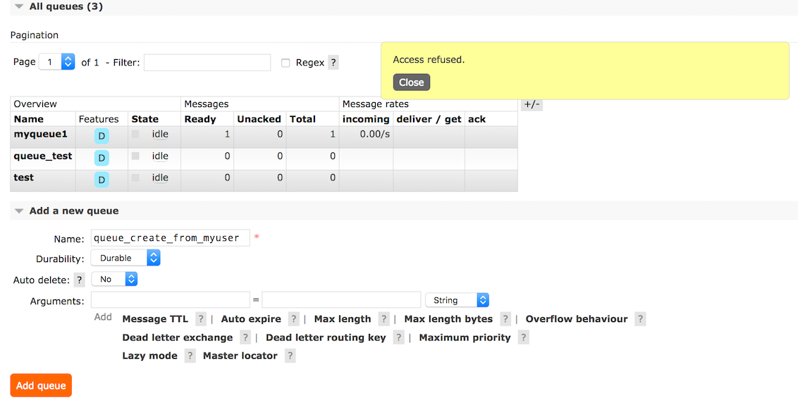 如果尝试使用用户myuser创建队列,则会得到以下错误: