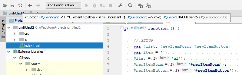但是,在WebStorm IDE中,$操作符在.js文件中的所有出现都被标记为“未解析函数”。