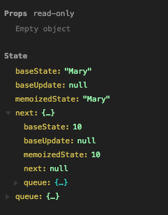 }对于具有两个状态的简单组件,该工具将状态显示为一个对象,baseState字段作为'Mary'的第一个状态值,还有一个next字段指向另一个状态对象,该对象对应于第二个状态值,并且它具有10的baseState值。