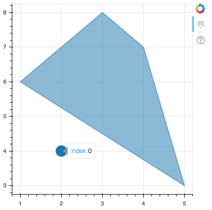 p.patches([[1, 2, 3, 4, 5]], [[6, 7, 8, 7, 3]], alpha=0.5, line_width=2)但是,这始终只返回0作为$index的值,因为只有一个补丁(其索引为0)。如果您希望为修补程序的顶点获取“索引”值,则需要在与顶点相同的位置执行一些类似于图的不可见圆的操作,这些圆圈仅用于命中测试目的(以驱动悬停工具)。