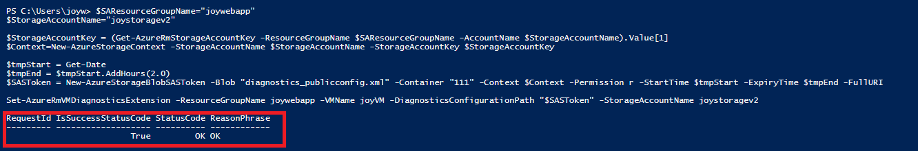 Set-AzureRmVMDiagnosticsExtension -ResourceGroupName joywebapp -VMName joyVM -DiagnosticsConfigurationPath "$SASToken" -StorageAccountName joystoragev2