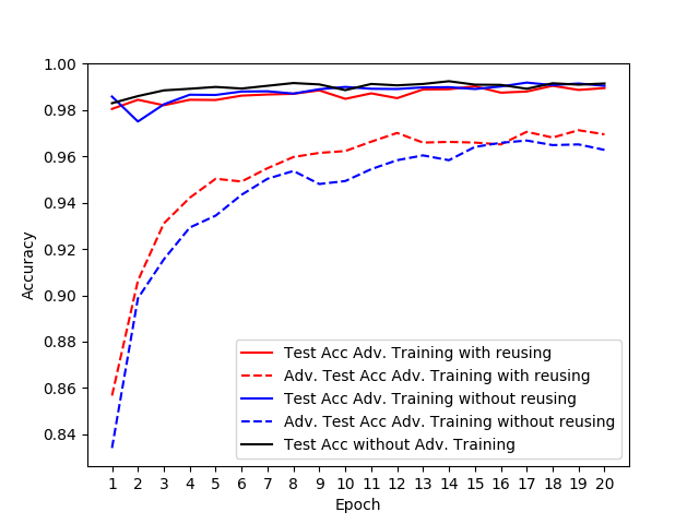 在总结,如果您只使用对抗性训练作为一个正则化,以提高测试的准确性本身,重复使用辍学面具可能是不值得的努力。对于对抗攻击的鲁棒性,可能会产生很小的影响。但是,您需要在其他数据集、体系结构、随机种子等上进行进一步的实验,才能做出更有信心的声明。