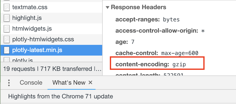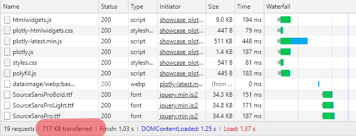 我已经运行了您的示例,数据大小最大的问题似乎是plotly-latest.min.js,它在磁盘上占用了大约2.8MB的存储空间。