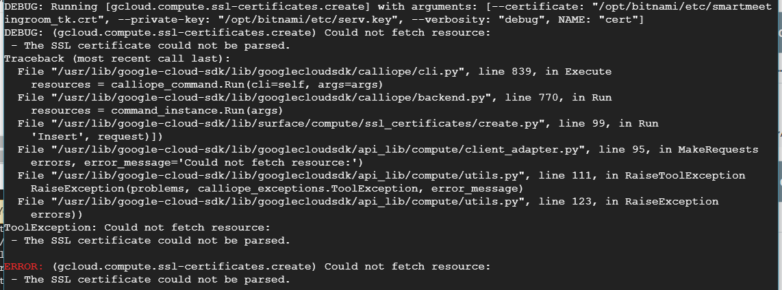 gcloud compute ssl-certificates create cert --certificate=/opt/bitnami/etc/smartmeetingroom_tk.crt --private-key=/opt/bitnami/etc/serv.key考虑:
