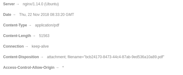 curl --request POST --url http://example.com --header 'Content-Type: multipart/form-data' --form files=@file.docx > result.pdfAPI只适用于cURL,当我尝试用Postman或AJAX点击相同的API时,我会得到一个响应,但是在保存详细信息或使用Postman预览响应时,我会得到一个空的PDF文件。