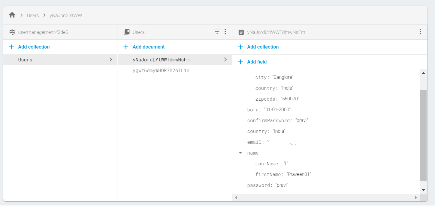 我使用一个名为email ID的键在子级别上搜索记录,但它总是返回null。下面是我的收集数据库和查询。
