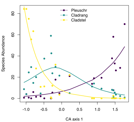 rda(formula = species.hel ~ Cu + Zn + Pb + PCA_axis1 + PCA_axis2, data = env)模型具有显着性,我所研究的污染物对物种群落有一定的影响,解释变量的方差达到37%。到目前为止,一切都还好,除了现在,我想画出单个物种的丰度随RDA1的变化情况,例如在Oksanen在线课程(http://cc.oulu.fi/~jarioksa/opetus/metodi/ordination101.html#33)中: