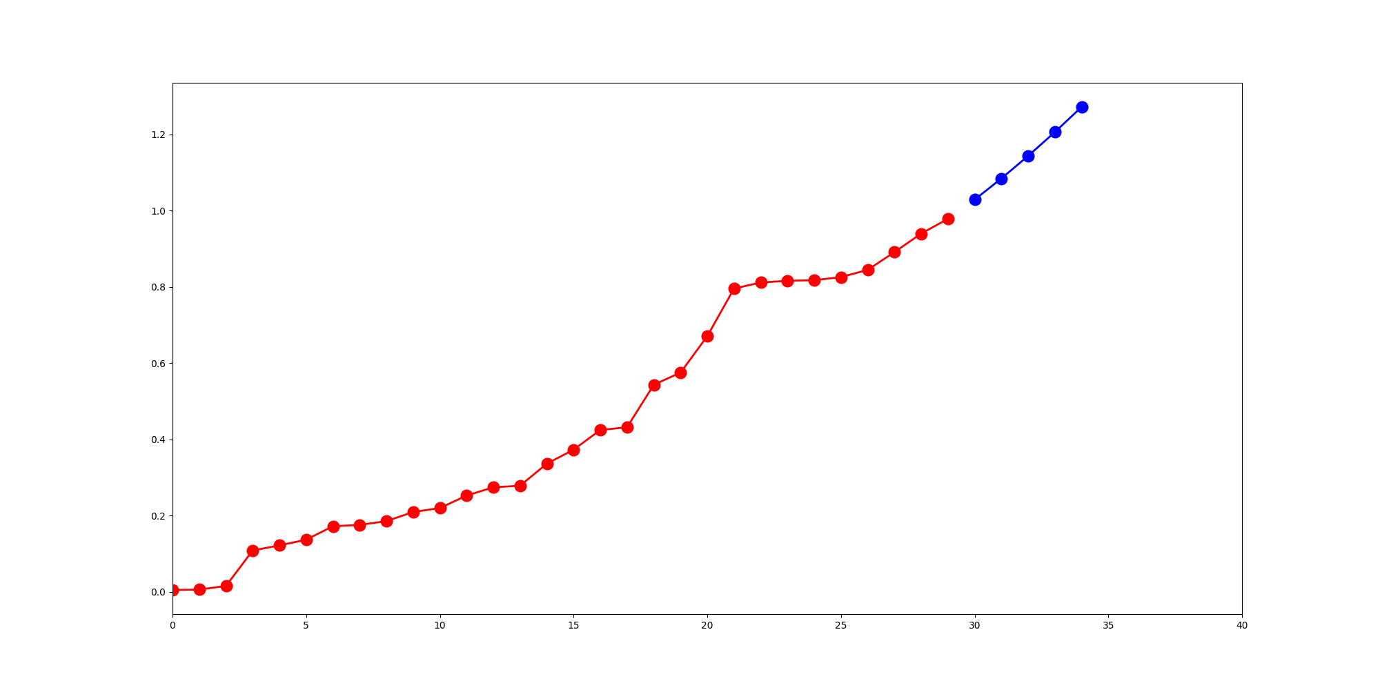 ax.plot(list(range(30,35)), sarima.forecast(steps_to_predict), "bo-", linewidth=2, markersize=12)输出:
