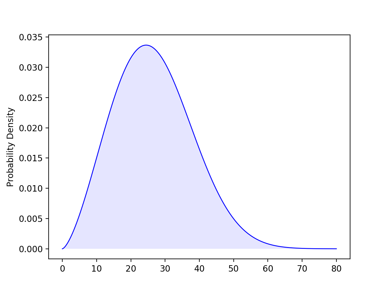 p = weibull_min.pdf(speeds, 2.5, scale=30)