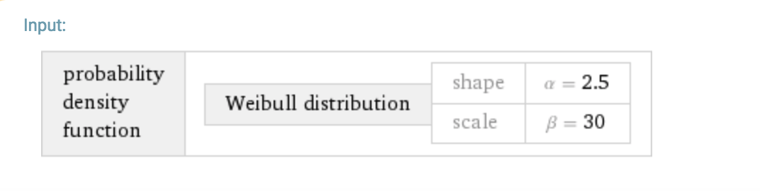 我发现scipy的weibull_min pdf函数既不直观,也很难使用。我想用scale=30和shape=2.5生成一个威布尔PDF。这就是我们应该看到的样子: