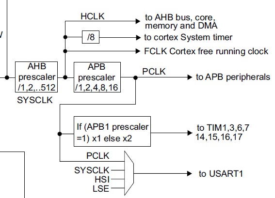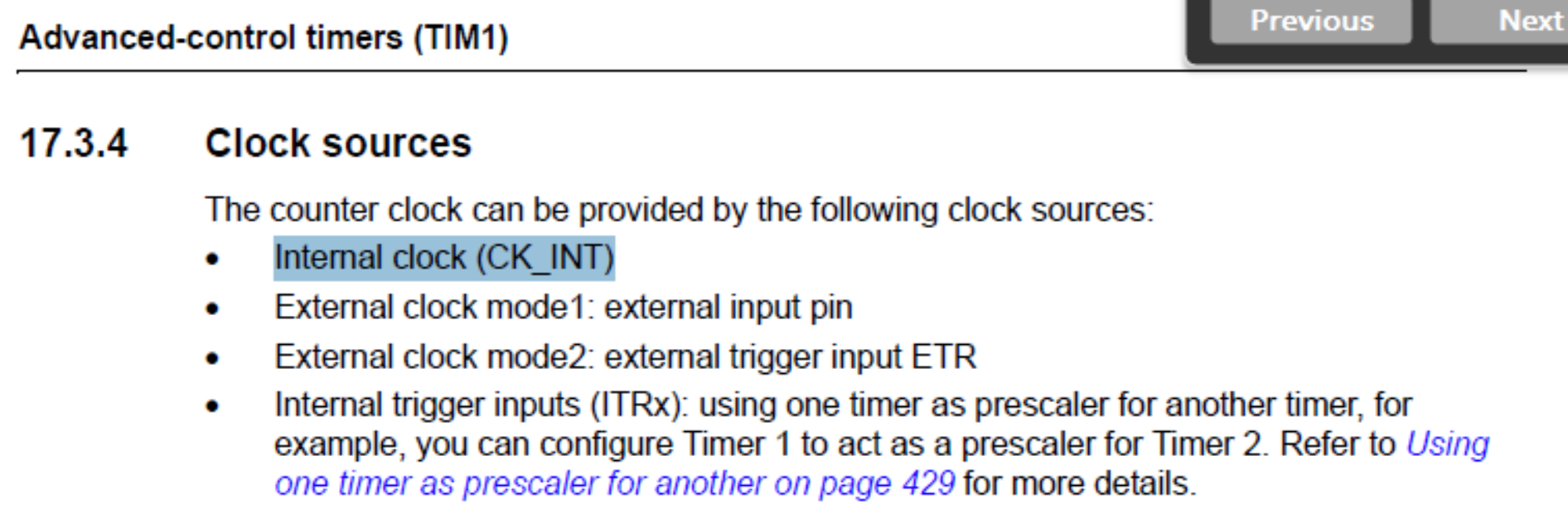 根据上面的数据表片段,TIM1可以由内部时钟(CK_INT)来时钟。这个内部时钟是什么?我有一种感觉,它只是在下面的时钟树中的APB1计时器时钟(Mhz),但这是正确的吗?为什么它在数据表中被称为内部时钟?