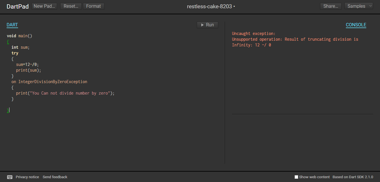 这里的问题是,dart2js是DartPad的基础,当您将整数除以零时,它不会抛出一个IntegerDivisionByZeroException (实际上应该命名为DivisionByZeroError,但实际上不是)。它抛出,但它使用的是UnsupportedError,否则这是一个很好的选择,这样的错误。