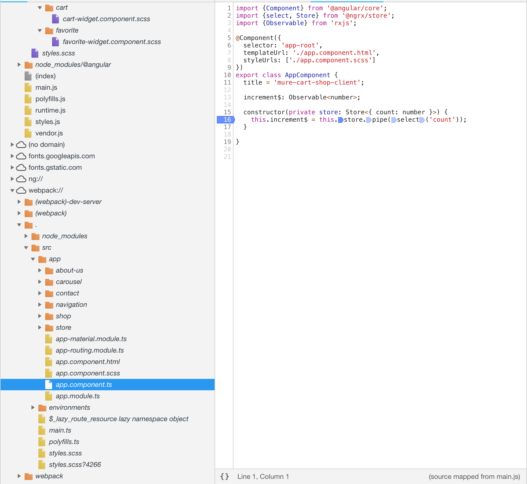 你有两个选择。如果您正在使用Chrome开发此应用程序,您可以使用开发工具,在webpack中找到您的源代码,并在服务中添加多个断点以进行调试。最棘手的部分是找到消息来源。从那里开始,应该是海峡前进。