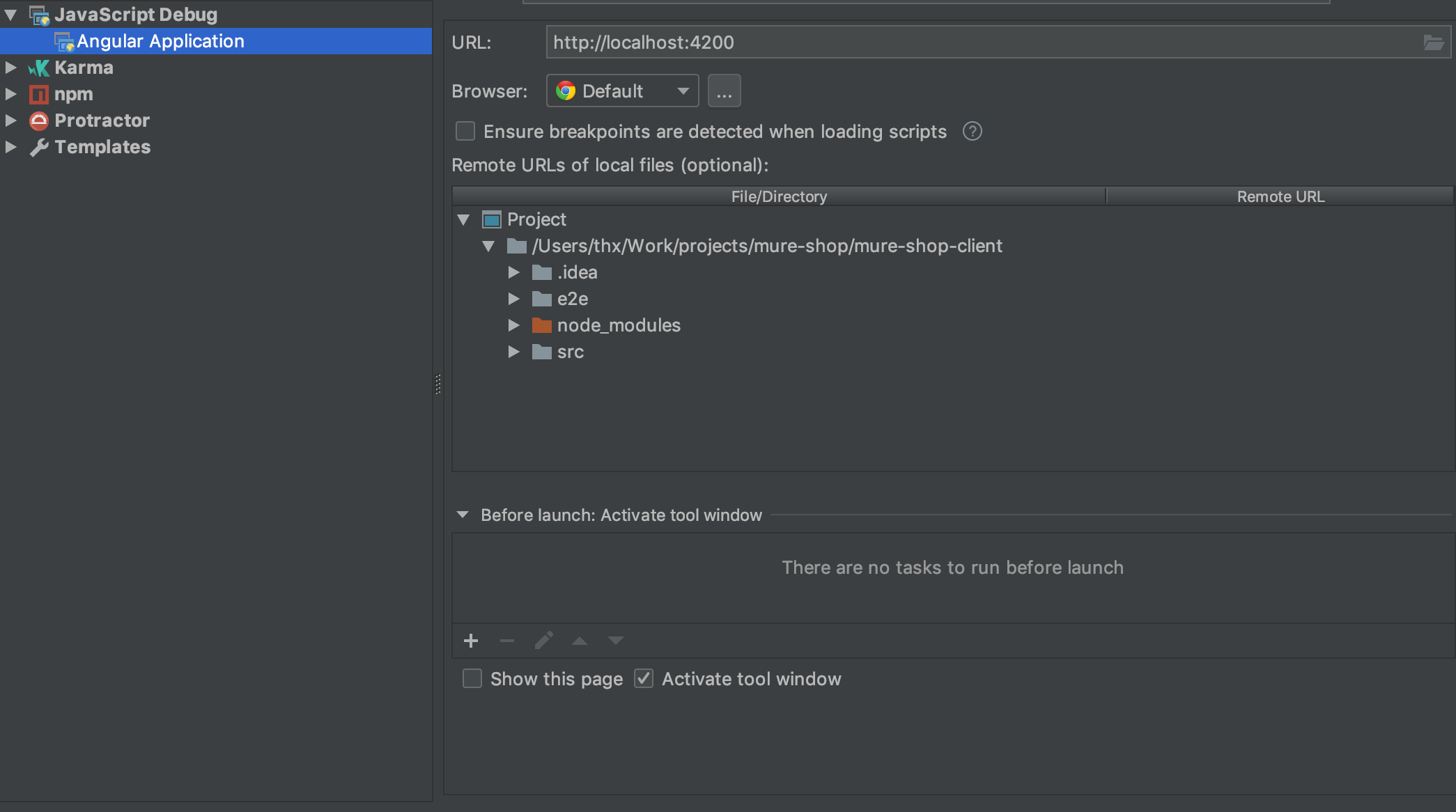 第二个选项,如果使用Intellij / WebStorm,可以在编辑器中调试应用程序。为此,必须在Chrome / Firefox中安装JetBrains IDE支持扩展,然后必须配置编辑器以添加新的配置:编辑器配置-> Javascript。您必须指定正确的端口(如果应用程序运行在不同的端口上)