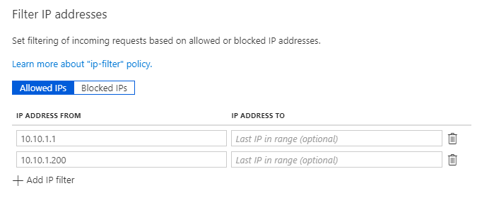 如果我查看下面的URl来限制API管理中的IP地址及其策略" IP -Filter",我们可以限制单个IP地址或范围。有没有办法过滤不同的IP地址,比如172.2.2.2,122.2.2.4,134.2.2.3?