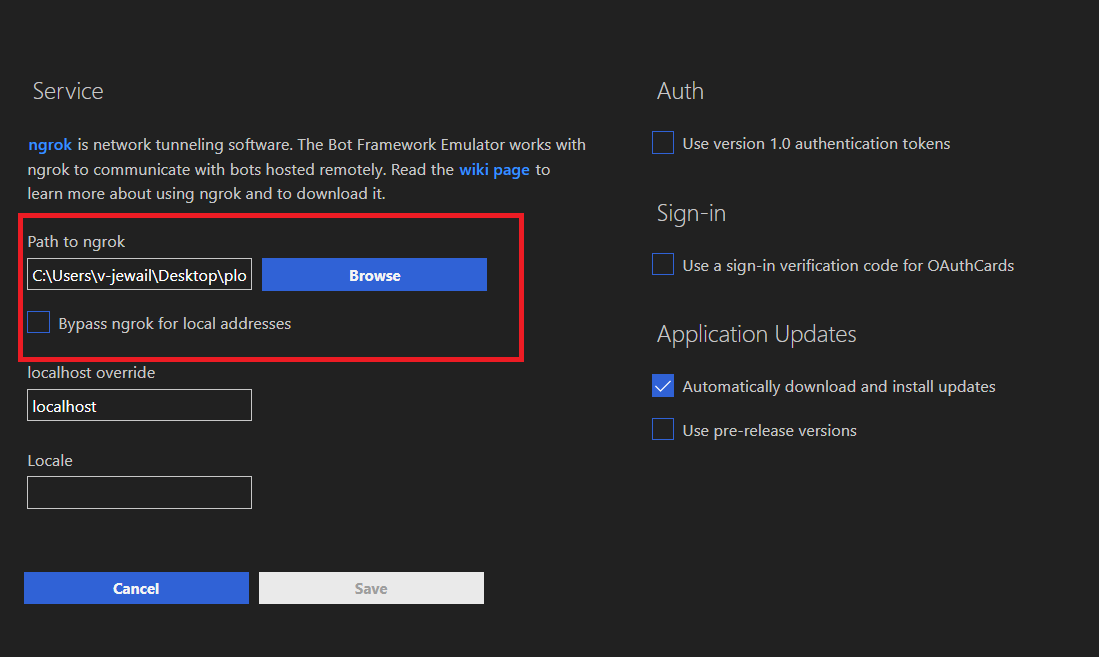 那一页会打开..。模拟器设置。在此页面中,使用“浏览”按钮导航到并选择ngrok.exe文件: