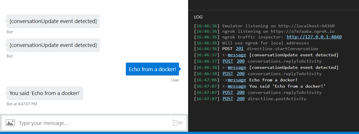 我终于能够让我的码头容器与我的仿真器一起工作,所以我将向您展示我必须改变什么才能使它工作!使用:模拟器4.2.1、ngrok和一个示例回波机器人: