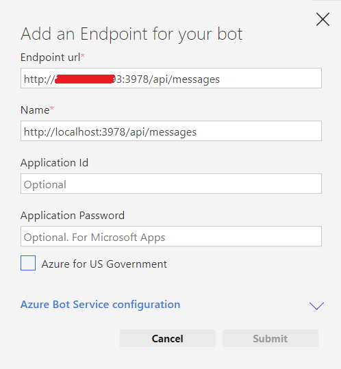 我在命令提示符中运行ipconfig /all以获取IPv4,然后返回模拟器。在我的机器人的配置中,我应该放在我的端点(通常是https://localhost:3978/api/messages)中,我用我的IPv4替换了'localhost‘这个词:
