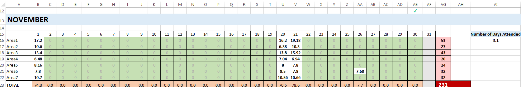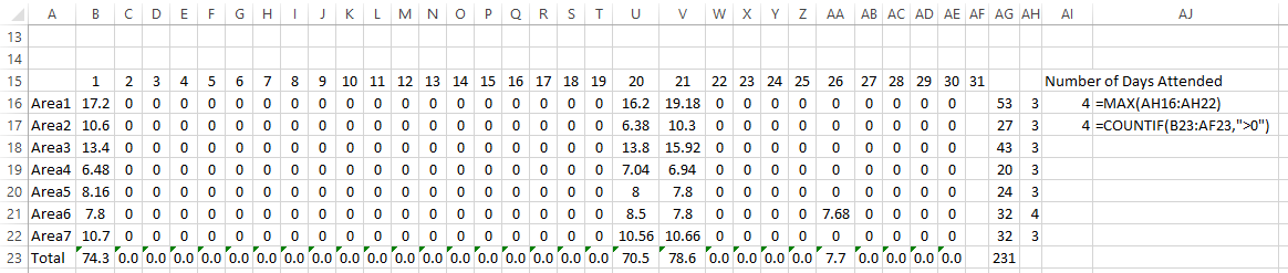 我有一个日历形式的excel表。该表显示了某一“区域”在任何一天使用的材料数量。单元格AI16需要查看每个日期,如果任何区域都使用了任何材料,则将其计算为“出席日”。
