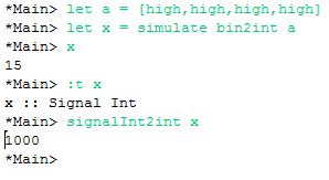 我正在使用一个描述数字电路(Lava)的Haskell libraby,它的功能输入和输出是信号类型(信号Bool,signal Int),据我所知,没有从信号Int转换为Int的函数,我知道有几个算术操作可以与类型信号Int一起使用,但并非所有的算术操作都是可能的。我编写了这个函数,它应该从Signal转换为Int (仅用于我需要的值)。