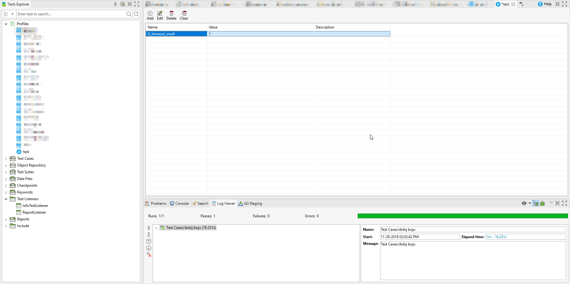 转到执行概要文件(在Katalon窗口右侧的“测试资源管理器”顶部的“profiles”),并将G_Timeout_Small设置为初始值(数字)。