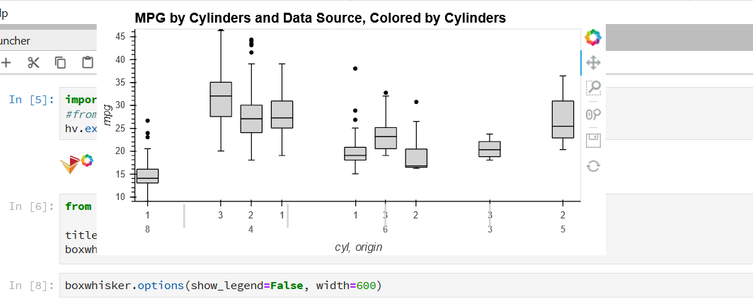 boxwhisker = hv.BoxWhisker(df, ['cyl', 'origin'], 'mpg', label=title)