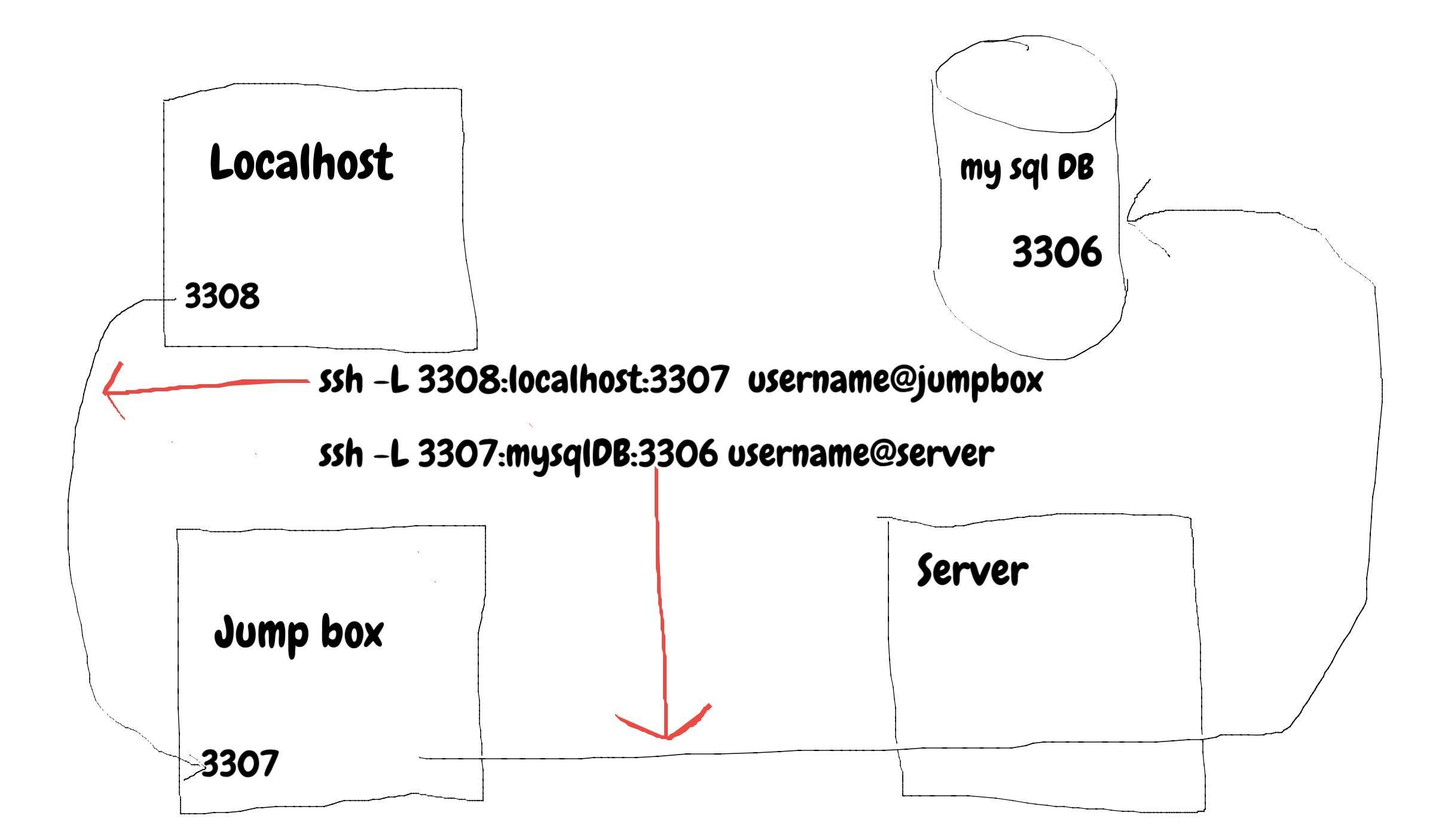 session在“跳转框”上运行ssh -L 3307:mysqlDB:3306 username@server。