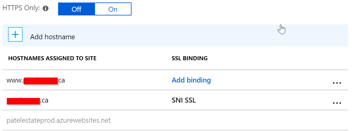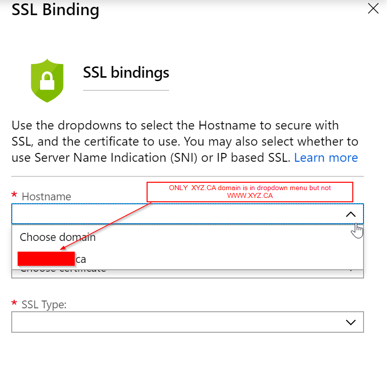 我刚从azure为我的网站购买了SSL证书。在“裸域名”下设置证书时,我输入的域名没有"www“。